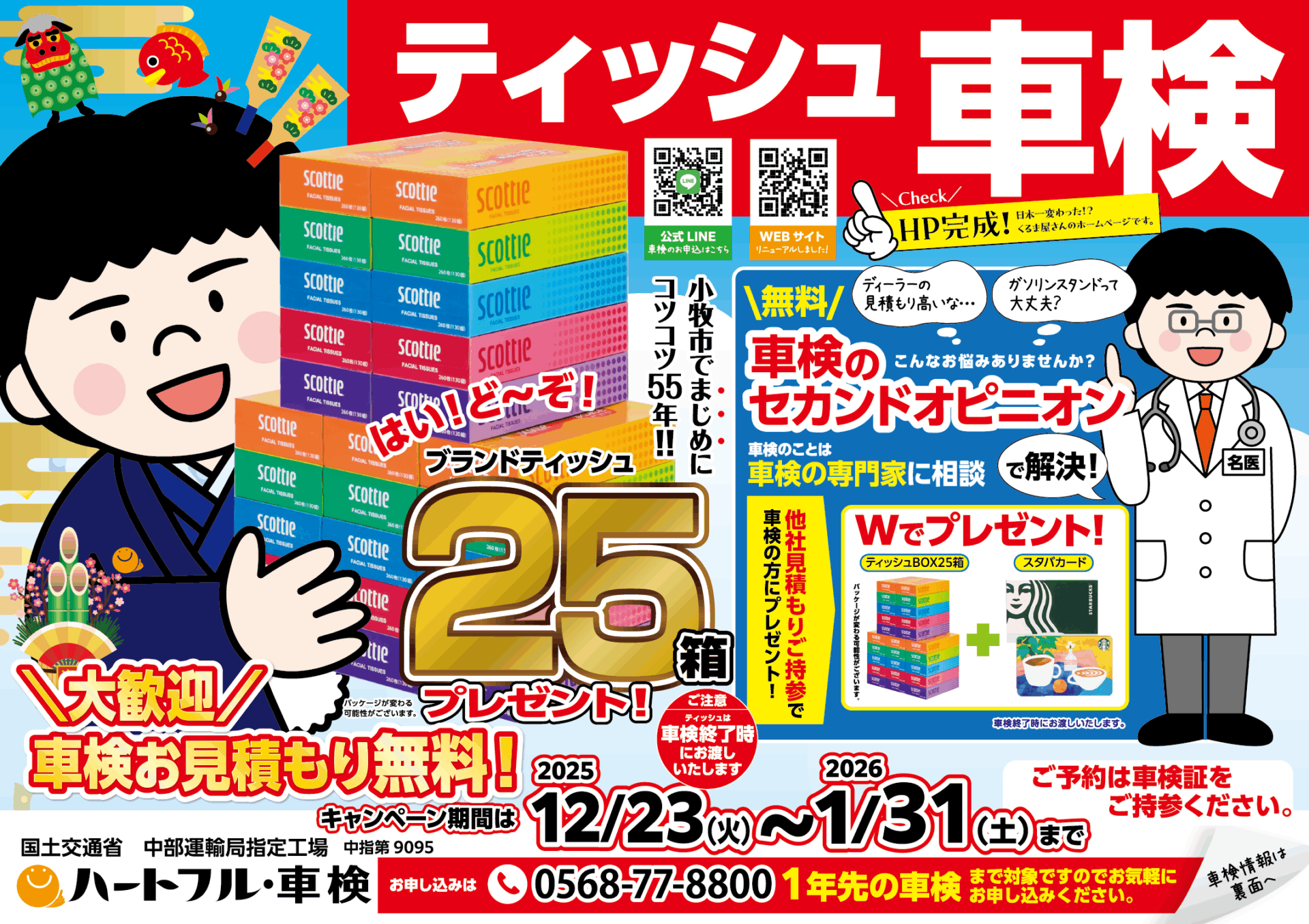 ティッシュ車検は、当社で車検を受けていただいたお客様にティッシュ25箱プレゼントする特別なサービスになります。